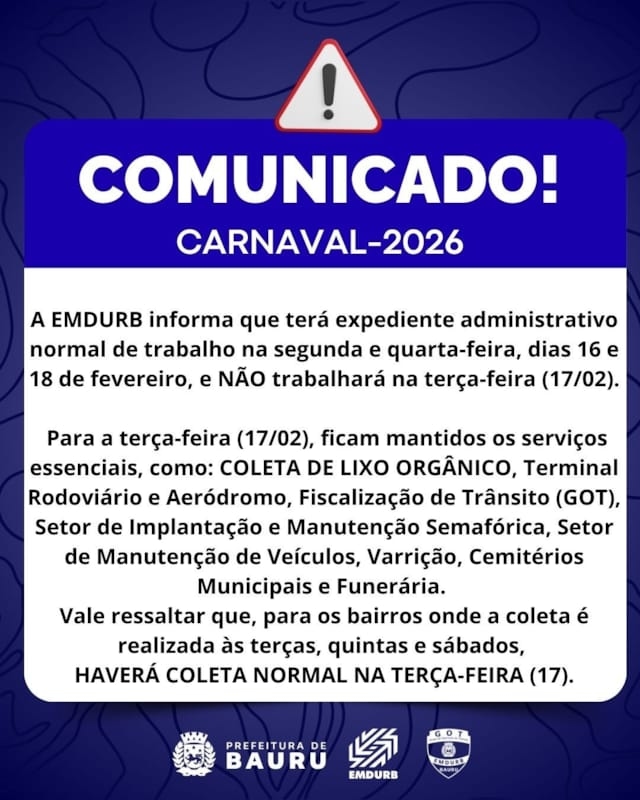 Para a terça-feira (17/02), ficam mantidos os serviços essenciais, como: COLETA DE LIXO ORGÂNICO, Terminal Rodoviário e Aeródromo, Fiscalização de Trânsito (GOT), Setor de Implantação e Manutenção Semafórica, Setor de Manutenção de Veículos, Varrição, Cemitérios Municipais e Funerária. Vale ressaltar que, para os bairros onde a coleta é realizada às terças, quintas e sábados, HAVERÁ COLETA NORMAL NA TERÇA-FEIRA (17).