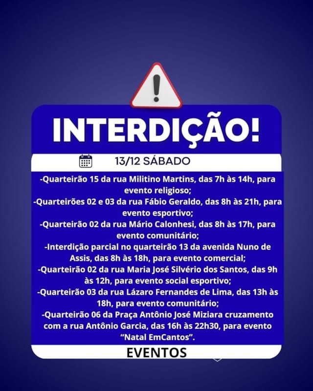 -Quarteirão 03 da rua Lázaro Fernandes de Lima, das 13h às 18h, para evento comunitário;