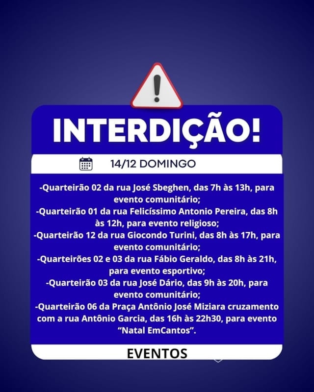 -Quarteirão 12 da rua Giocondo Turini, das 8h às 17h, para evento comunitário;