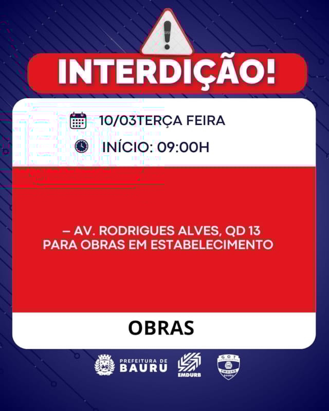 Bauru, 09 de março de 2026EMDURB informa interdições programadas para terça-feira (10) A Diretoria de Sistema Viário e Transportes da EMDURB, por meio do GOT, informa as seguintes interdições para terça-feira (10):-Quarteirão 13 da Av Rodrigues Alves, das 09h às 16h, para obras em estabelecimento; Os locais estarão sinalizados pelo GOT – Grupo de Operações de Trânsito. A EMDURB pede atenção aos motoristas.Acesse o link e participe da comunidade GOT e receba as interdições.https://chat.whatsapp.com/H9DZAyZCfXf3ata4FZ2gyqComunicação – EMDURB