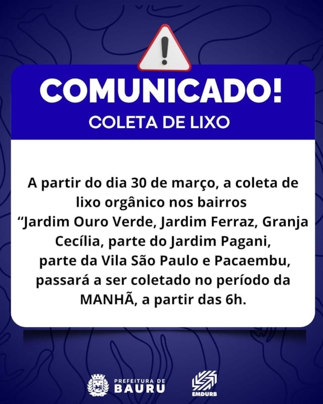 A EMDURB informa que a partir do dia 30 de março (segunda-feira) dois setores da coleta de lixo orgânico que hoje são realizados no período noturno, passarão a ter o lixo coletado no período da manhã, a partir das 6h.