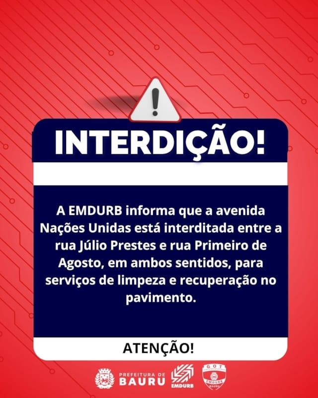 A EMDURB informa que a avenida Nações Unidas está interditada entre a rua Júlio Prestes e rua Primeiro de Agosto, em ambos sentidos, para serviços de limpeza e recuperação no pavimento. A liberação da via está prevista para sexta-feira (27), no período da tarde.