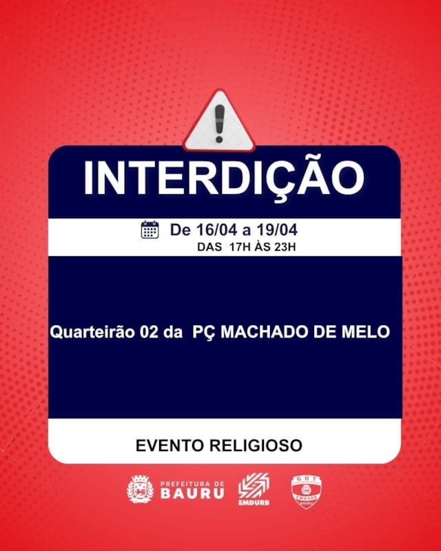 A Diretoria de Sistema Viário e Transportes da EMDURB, por meio do GOT, informa as seguintes interdições para quinta-feira (16):-Quarteirão 02 da Pç Machado de Melo, do dia 16/04 a 19/04, das 17h às 23h, para evento religioso. Os locais estarão sinalizados pelo GOT – Grupo de Operações de Trânsito. A EMDURB pede atenção aos motoristas.Acesse o link e participe da comunidade GOT e receba as interdições.https://chat.whatsapp.com/H9DZAyZCfXf3ata4FZ2gyqComunicação – EMDURB