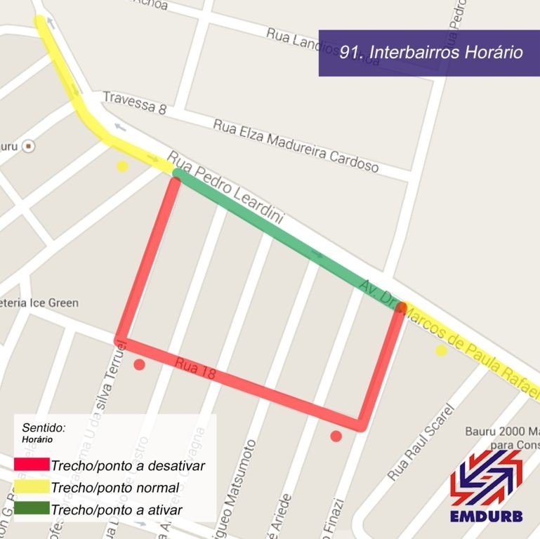 A Emdurb informa que a partir desta quinta-feira (27), as linhas Interbairros sentido Horário e Anti Horário, terão seus itinerários alterados. Deixarão de circular pela rua Antonio Montebugnol e perpendiculares, passando a circular somente pela avenida Marcos de Paula Rafael. A mudança visa dar mais agilidade a linha, reduzindo o tempo total de viagem.