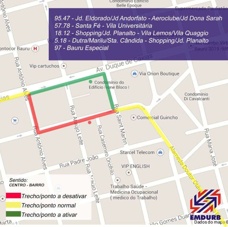 A Emdurb informa que a partir de quinta-feira (10), cinco linhas do transporte coletivo deixarão de circular pelas ruas Antonio Alves e Aviador Gomes Ribeiro, passando a circular pela avenida Duque de Caxias e rua Eng Saint Martin.