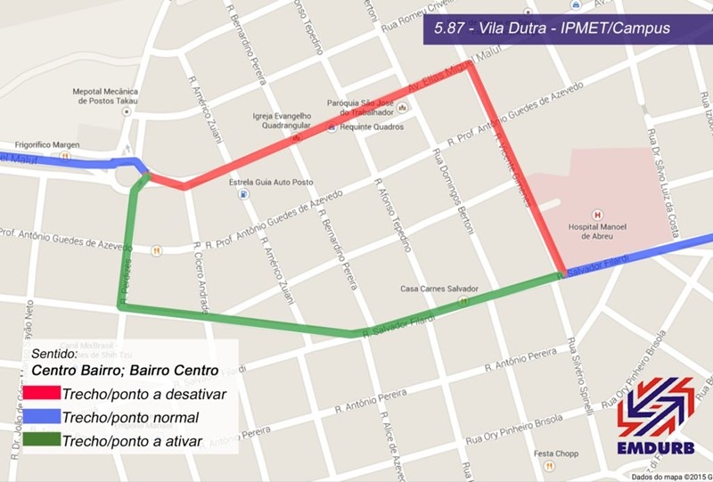 -Centro para Bairro: Não circulará pela avenida Elias Miguel Maluf até quarteirão 08. Circulará pela rua Wenceslau Braz, rua Perdizes e retornará para Elias Miguel Maluf.