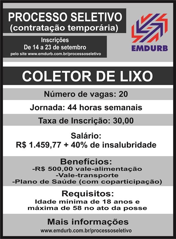 A EMDURB publicará na edição de sábado (05) do Diário Oficial do Município, edital com período de inscrições para realização de processo seletivo para contratação temporária, por prazo determinado, para as funções de Coletor de Lixo, visando o preenchimento de 20 (vinte), com jornada de 44 horas semanais. Será admitida a inscrição somente via Internet, no endereço eletrônico, www.emdurb.com.br/processoseletivo, solicitada no período das de 14 a 23/09/2020, observado o horário oficial de Brasília/DF. A taxa de inscrição é de R$ 30,00 (trinta reais) e deve ser paga através de boleto bancário gerado no sistema.O salário é de R$ 1.459,77 (mil quatrocentos e cinquenta e nove reais e setenta e sete centavos), mais adicional de insalubridade de 40%, mais vale-alimentação no valor de R$ 500,00 (quinhentos reais), vale-transporte conforme legislação vigente e Plano de Saúde com coparticipação do funcionário. São requisitos básicos para o cargo: Ter idade mínima de 18 (dezoito) anos completos e máxima de 58 (cinquenta e oito) anos no momento da contratação e não possuir nenhuma das comorbidades: gestantes ou lactantes, portadores de doença respiratória, com doença pulmonar crônica, em tratamento oncológico, em realização de radioterapia ou quimioterapia, portadores de cardiopatia crônica, portadores de diabetes, portadores de doença renal crônica, imunosuprimidos e portadores de doenças autoimunes, e ainda, ter concluído o Ensino Fundamental completo no ato da inscrição, estar em dia com a Justiça Eleitoral, estar no gozo dos seus Direitos Políticos e Civis.DESCRIÇÃO SUMÁRIA DO CARGO: Executar a coleta de resíduos (orgânico ou reciclável) em vias públicas e logradouros públicos, colocando-os em veículos apropriados, mantendo a limpeza e a higiene do município. O edital completo pode ser acessado no site da EMDURB www.emdurb.com.br/processoseletivoComunicação - EMDURB03/09/2020