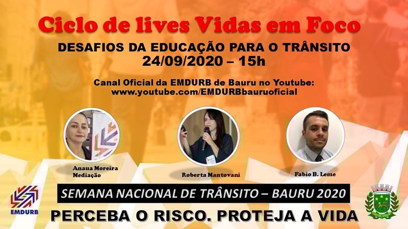 Dando sequência à programação da Semana Nacional de Trânsito, hoje, às 15h, acontecerá a live com o tema “Desafios da Educação para o Trânsito”.