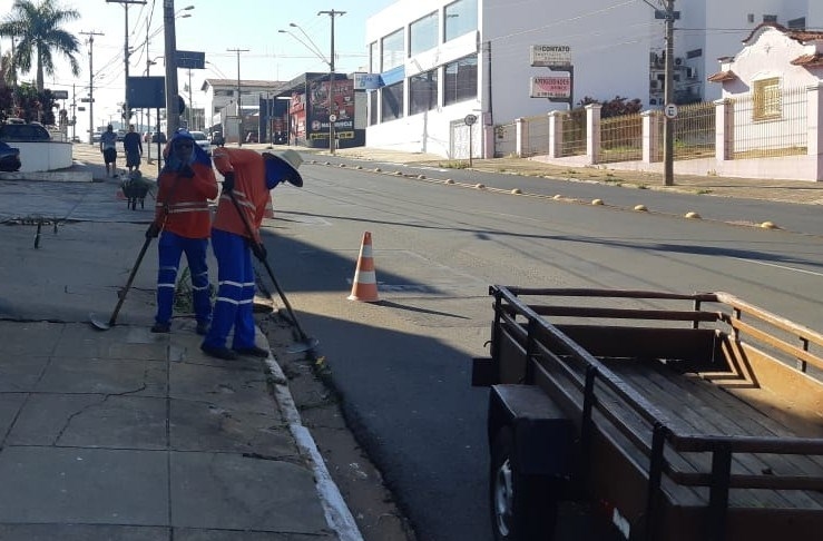 A equipe de varrição feminina realiza serviço de limpeza no Calçadão, Primeiro de Agosto e ruas transversais.