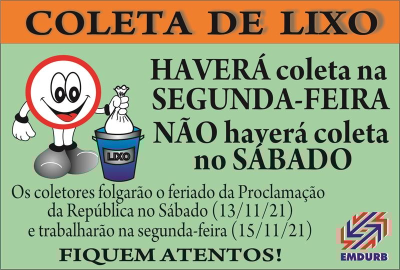 Os coletores folgarão o feriado da Proclamação da República no sábado (13) e trabalharão na segunda-feira (15). Desta forma, NÃO HAVERÁ COLETA ORGÂNICA e SELETIVA no sábado (13), voltando ao normal na segunda-feira (15). A troca da folga foi feita em comum acordo entre diretoria e funcionários da coleta de lixo.