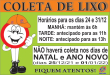 Nos dias de Natal e Ano Novo (25/12 e 01/01, respectivamente) NÃO HAVERÁ SERVIÇO DE COLETA, voltando ao normal na segunda-feira (27/12/21 e 03/01/22). Vale ressaltar que, para os bairros onde a coleta é realizada às terças, quintas e sábados, NÃO HAVERÁ COLETA ORGÂNICA e SELETIVA no sábado (dia 25/12/21 e 01/01/22).