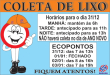 O serviço de coleta de lixo terá o horário alterado no dia 31 (sexta-feira). A coleta da manhã será mantida às 6h, a coleta da tarde será antecipada para as 11h e a coleta noturna para as 13h.