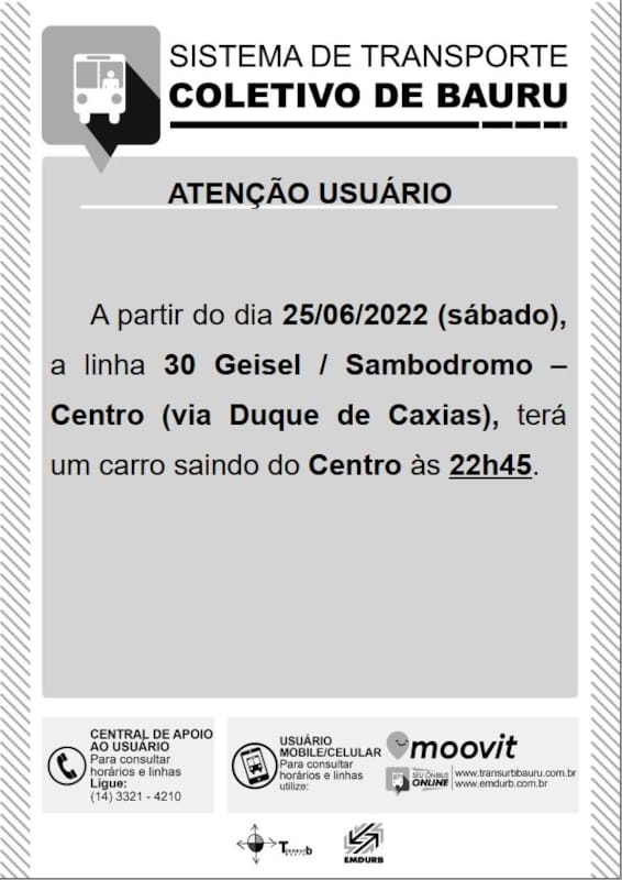 A EMDURB informa que a partir de sábado (25/06), será implantado um horário às 22h45, saindo do Centro para o Geisel na linha “Geisel/Sambódromo – Centro (via Duque de Caxias)”na tabela horária de SÁBADO. A nova tabela horária estará disponível no site da EMDURB https://www.emdurb.com.br/transpcoletivo Qualquer dúvida, entrar em contato pelo telefone 3321-4210. Sugestões, solicitações e reclamações podem ser enviadas para ouvidoria@bauru.sp.gov.brComunicação – EMDURB24/06/2022