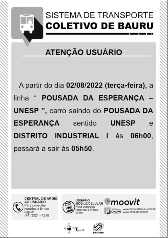 A EMDURB informa que a partir de terça-feira (02/08), haverá remanejamento em UM horário dos DIAS ÚTEIS da linha “Pousada da Esperança – UNESP”. O horário das 06:00 que sai da Pousada da Esperança sentido Distrito Industrial I e sentido UNESP passará a sair às 05:50. Não haverá alteração na tabela horária de Sábado, Domingos e Feriados. A nova tabela horária estará disponível no site da EMDURB https://www.emdurb.com.br/transpcoletivo Qualquer dúvida, entrar em contato pelo telefone 3321-4210. Sugestões, solicitações e reclamações podem ser enviadas para ouvidoria@bauru.sp.gov.brComunicação – EMDURB28/07/2022