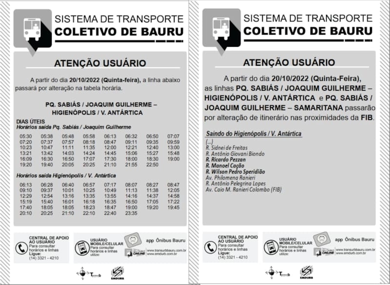 Também na quinta-feira (20/10), a linha “Pq Sabiás/Joaquim Guilherme-Samaritana” passará por alteração no itinerário nas proximidades da FIB – Faculdades Integradas de Bauru, passando a circular pelas ruas Ricardo Pezzan, Manoel Cação e Wilson Pedro Speridião.