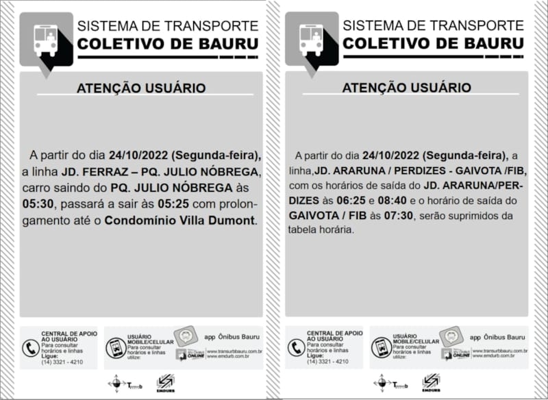 A EMDURB informa que a partir de segunda-feira (24/10), estão previstas alterações em duas linhas do sistema de transporte coletivo, sendo:-Linha “Jd Ferraz – Pq Júlio Nóbrega”: o horário das 05:30 que sai do Pq Júlio Nóbrega passará a sair às 05:25 e o itinerário será prolongado até o residencial Villa Dumont.-Linha Jd Araruna/Perdizes – Gaivota/FIB”: os horários das 06:25 e 08:40 saindo do Jd Araruna/Perdizes e o horário das 07:30 saindo do Gaivota/FIB serão suprimidos da tabela horária. A EMDURB pede atenção aos usuários do sistema de transporte coletivo. Informações sobre horários e itinerários estão disponíveis no site da EMDURB https://www.emdurb.com.br/transpcoletivo Qualquer dúvida, entrar em contato pelo telefone 3321-4210. Sugestões, solicitações e reclamações podem ser enviadas para ouvidoria@bauru.sp.gov.brComunicação – EMDURB21/10/2022