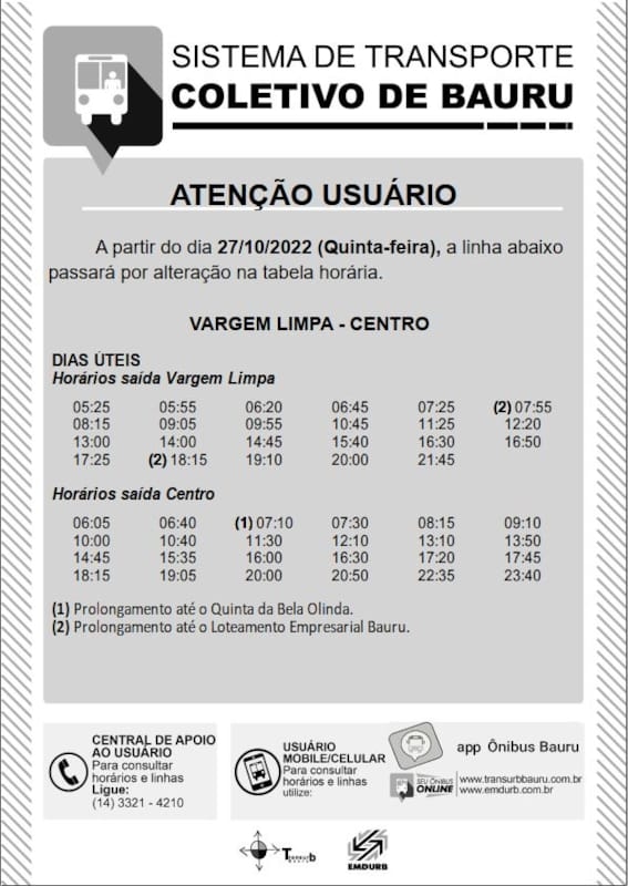 A EMDURB informa que a partir de quinta-feira (27/10), haverá alteração na tabela dos DIAS ÚTEIS da linha “Vargem Limpa - Centro”. Não haverá alteração na tabela horária de Sábado, Domingos e Feriados. A nova tabela horária estará disponível no site da EMDURB https://www.emdurb.com.br/transpcoletivo Qualquer dúvida, entrar em contato pelo telefone 3321-4210. Sugestões, solicitações e reclamações podem ser enviadas para ouvidoria@bauru.sp.gov.brComunicação – EMDURB24/10/2022