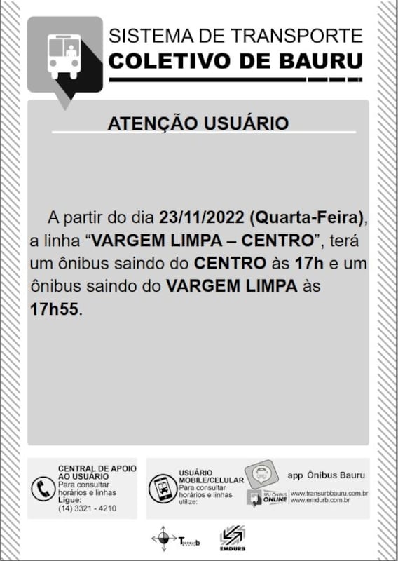 A EMDURB informa que a partir de quarta-feira (23/11), estão previstas alterações em duas linhas do sistema de transporte coletivo, sendo:-Linha “Vargem Limpa - Centro”: será implantado um horário às 17h saindo do Centro para o bairro Vargem Limpa e um horário às 17h55 saindo do bairro Vargem Limpa para o Centro.-Linha “Vila Garcia/Jd TV - Centro”: o horário das 17h45 saindo da Vila Garcia/Jd TV será suprimido da tabela horária. A EMDURB pede atenção aos usuários do sistema de transporte coletivo. Informações sobre horários e itinerários estão disponíveis no site da EMDURB https://www.emdurb.com.br/transpcoletivo Qualquer dúvida, entrar em contato pelo telefone 3321-4210.Comunicação – EMDURB22/11/2022