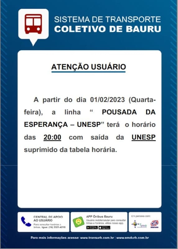 A EMDURB informa que a linha “Pousada da Esperança - Unesp” terá alteração em sua tabela horária. A partir desta quarta-feira, 01/02, será retirado da tabela o horário das 20h, com saída da Unesp.Comunicação - EMDURB