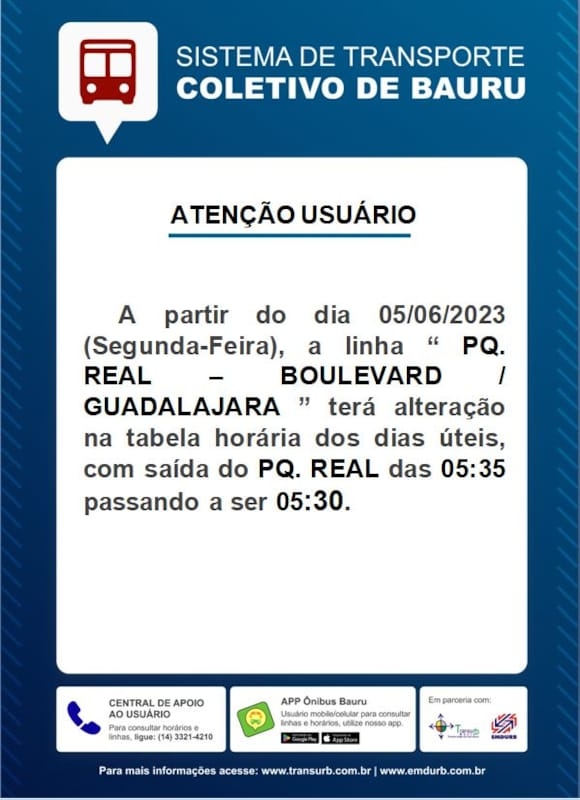 A Gerência de Transporte Coletivo da EMDURB informa que partir desta segunda-feira, 05/06, a linha “Pq. Real-Boulevard/Guadalajara” terá alteração de horário dos dias úteis.A alteração será no horário saindo do Parque Real, que passará das 05h35 para as 05h30, A EMDURB pede atenção aos usuários do sistema de transporte coletivo. Informações sobre horários e itinerários estão disponíveis no site da EMDURB https://www.emdurb.com.br/transpcoletivo Qualquer dúvida, entrar em contato pelo telefone 3321-4210.