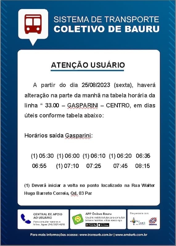 A EMDURB informa que partir desta sexta-feira, 25, a linha “Gasparini-Centro” terá alteração de horário em dias úteis:(1) 05:30, (1) 06:00, (1)06:10, (1)06:20, 06:35, 06:55, (1) 07:10, 07:25, 07:45, 08:15. (1) Deverá iniciar a volta no ponto localizado na rua Walter Hugo Barreto Correia, quarteirão 03.A EMDURB pede atenção aos usuários do sistema de transporte coletivo. Informações sobre horários e itinerários estão disponíveis no site da EMDURB https://www.emdurb.com.br/transpcoletivo Qualquer dúvida, entrar em contato pelo telefone 3321-4210.