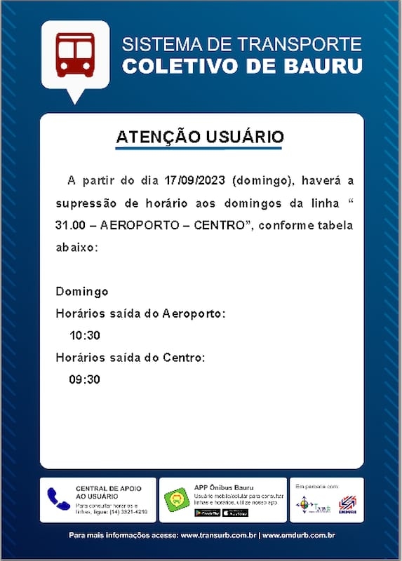 A EMDURB informa que partir deste domingo, 17, a linha “Aeroporto - Centro” terá supressão de horário aos domingos, sendo:Saída do Aeroporto: 10h30Saída do Centro: 09h30Os horários podem ser conferidos na tabela em anexo. A EMDURB pede atenção aos usuários do sistema de transporte coletivo. Informações sobre horários e itinerários estão disponíveis no site da EMDURB https://www.emdurb.com.br/transpcoletivo Qualquer dúvida, entrar em contato pelo telefone 3321-4210.