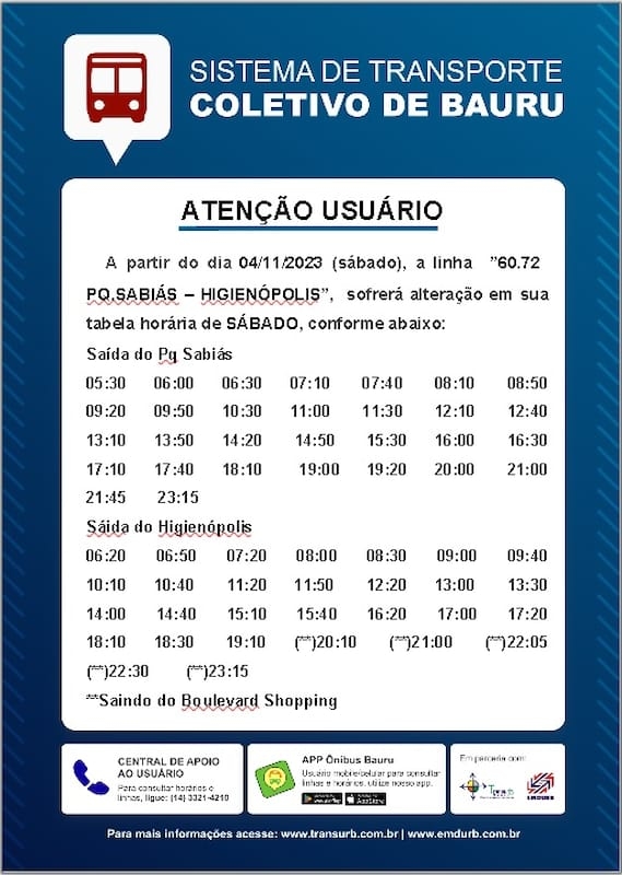 A EMDURB informa que partir de sábado, 04/11, a linha “Pq. Sabiás-Higienópolis” terá alteração na tabela de horários de sábado, conforme tabela em anexo. A EMDURB pede atenção aos usuários do sistema de transporte coletivo. Informações sobre horários e itinerários estão disponíveis no site da EMDURB https://www.emdurb.com.br/transpcoletivo Qualquer dúvida, entrar em contato pelo telefone 3321-4210.