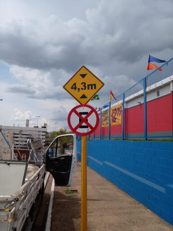 O Setor de Sinalização da EMDURB, com apoio do GOT, substituiu nesta quinta-feira, 09, as placas indicativas de altura no viaduto da linha férrea, no quarteirão 04 da avenida Nações Unidas. Técnicos da EMDURB constataram que após o recape da via, a altura do viaduto mudou de 4,40m para 4,30m e com isso, houve a necessidade da substituição da placa.Os motoristas de caminhões com altura superior a essa devem evitar a via.