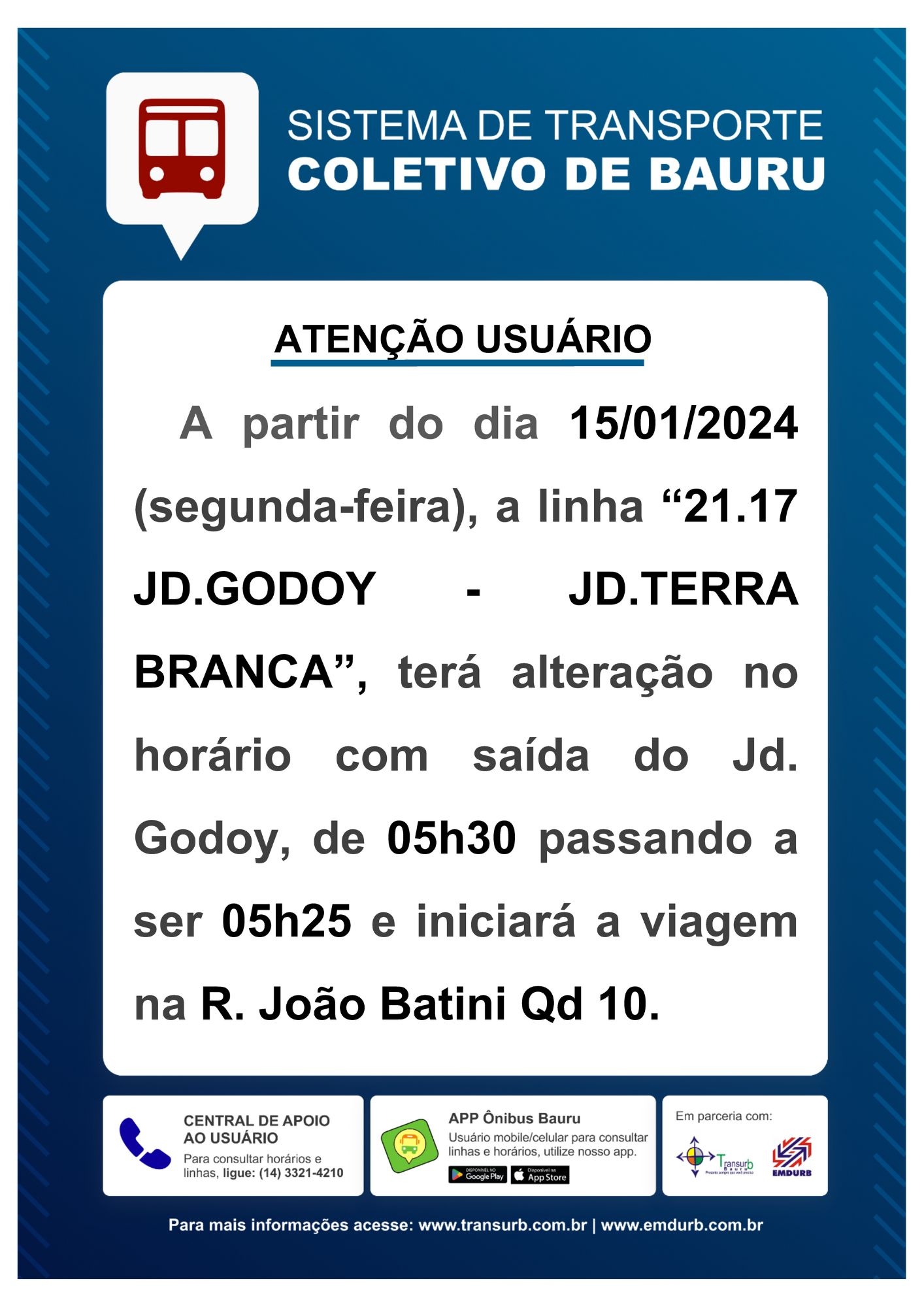 A Gerência de Transporte Coletivo da EMDURB informa que partir da próxima segunda-feira, 15/01, a linha “Jd. Godoy – Jd. Terra Branca” terá alteração no primeiro horário.
