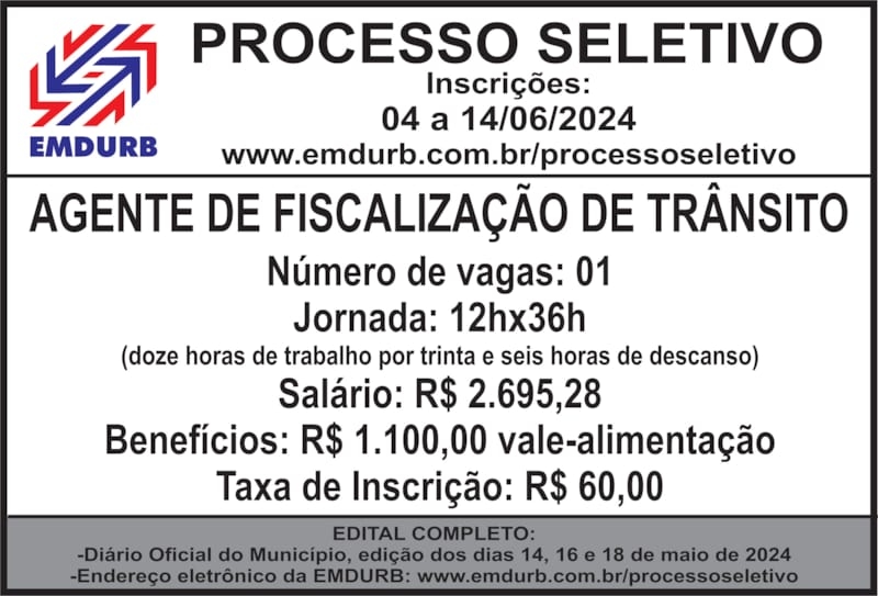 A EMDURB abre no mês de junho (04 a 14) as inscrições para o processo seletivo de Agente de Fiscalização de Trânsito.As inscrições serão realizadas exclusivamente pela internet, no endereço eletrônico www.emdurb.com.br/processoseletivo , observado o horário oficial de Brasília/DF. O edital completo também pode ser acessado pelo endereço eletrônico da EMDURB: www.emdurb.com.br/processoseletivoO processo seletivo visa o preenchimento de uma vaga, com jornada de 12hx36h (doze horas de trabalho por trinta e seis horas de descanso), para trabalho no período diurno ou noturno, inclusive aos sábados, domingos e feriados, de acordo com as necessidades alusivas às peculiaridades de sua função. A escolaridade exigida e respectivos requisitos são: Ensino médio completo e Possuir Carteira de Habilitação categoria “A” e “B”.O salário é de R$ R$ 2.695,28 (dois mil e seiscentos e noventa e cinco reais e vinte e oito centavos), adicional noturno, pago em caso de exercício em horário noturno, e benefício de vale-alimentação mensal no valor de R$ 1.100,00 (um mil e cem reais), vale-transporte, conforme legislação vigente e plano de saúde, com coparticipação do funcionário. A taxa de inscrição é de R$ 60,00 (sessenta reais) e deve ser paga através de boleto bancário gerado no sistema.DESCRIÇÃO SUMÁRIA DO CARGO: Exercer a fiscalização de trânsito nos termos legais, orientar, sugerir, autuar condutores de veículos e ciclistas no âmbito Municipal, de acordo com as normas do Código de Trânsito Brasileiro. Executar interdições e desvio do sistema viário.