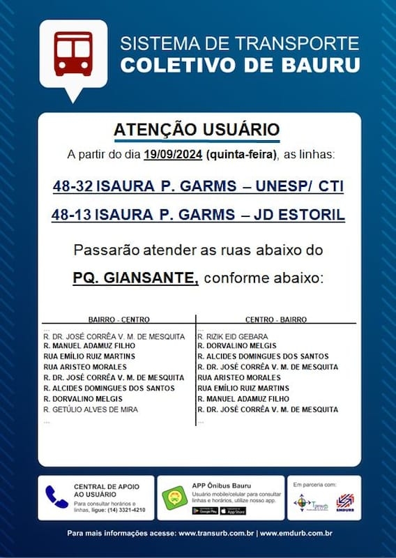 A partir desta quinta-feira, 19/09, as linhas “Isaura P. Garms -Unesp/CTI” e “Isaura P. Garms -Jd. Estoril” terão alteração de itinerário.As linhas passarão a atender ruas do Parque Giansante, conforme tabela em anexo.Informações sobre horários e itinerários estão disponíveis no site da EMDURB https://www.emdurb.com.br/transpcoletivo Qualquer dúvida, entrar em contato pelo telefone 3321-4210.