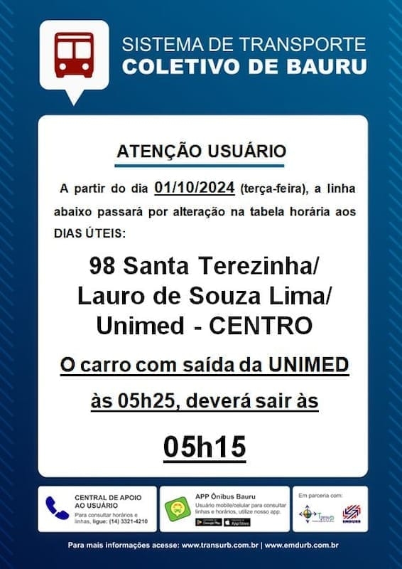 A partir da próxima terça-feira, 26/09, as linhas “Santa Terezinha/ Lauro S. Lima/Unimed-Centro” e “Jd. Godoy-Jd. Terra Branca” terão alteração na tabela horária aos dias úteis.