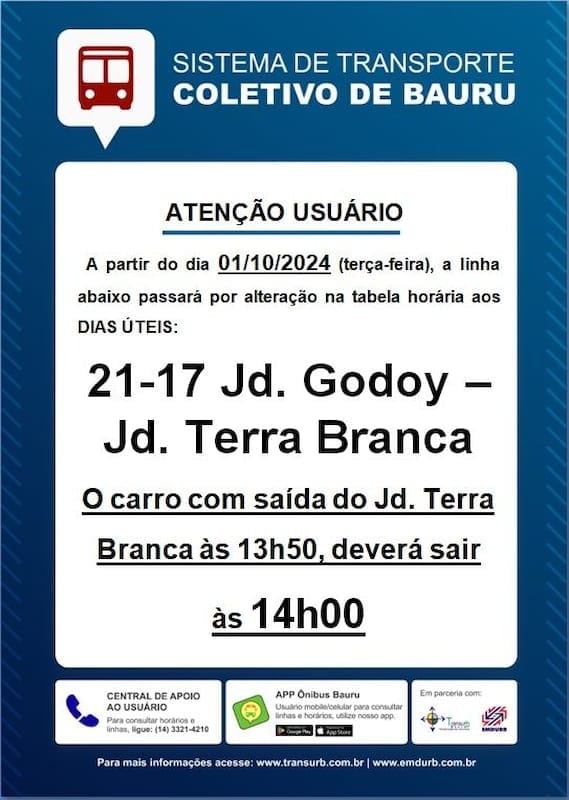 Já a linha “Jd. Godoy-Jd. Terra Branca” terá a saída do Jd. Terra Branca alterada das 13h50 para as 14h.