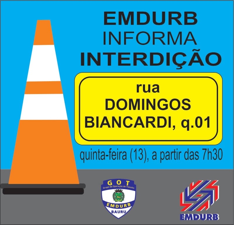 A Diretoria de Sistema Viário e Transportes da EMDURB, por meio do GOT, informa a seguinte interdição:-Interdição no quarteirão 01 da rua Domingos Biancardi, a partir das 7h30, para serviços do DAE. O local estará sinalizado pelo GOT – Grupo de Operações de Trânsito. A EMDURB pede atenção aos motoristas.Comunicação – EMDURB