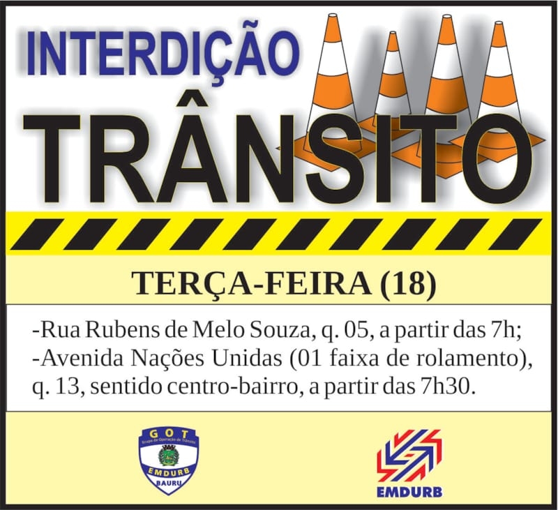 A Diretoria de Sistema Viário e Transportes da EMDURB, por meio do GOT, informa a seguinte interdição:-Interdição no quarteirão 05 da rua Rubens de Melo Souza, das 7h às 17h, para serviço de concretagem;-Interdição parcial no quarteirão 13 da avenida Nações Unidas, sentido centro-bairro, a partir das 7h30,para obras do DAE. O local estará sinalizado pelo GOT – Grupo de Operações de Trânsito. A EMDURB pede atenção aos motoristas.Comunicação – EMDURB