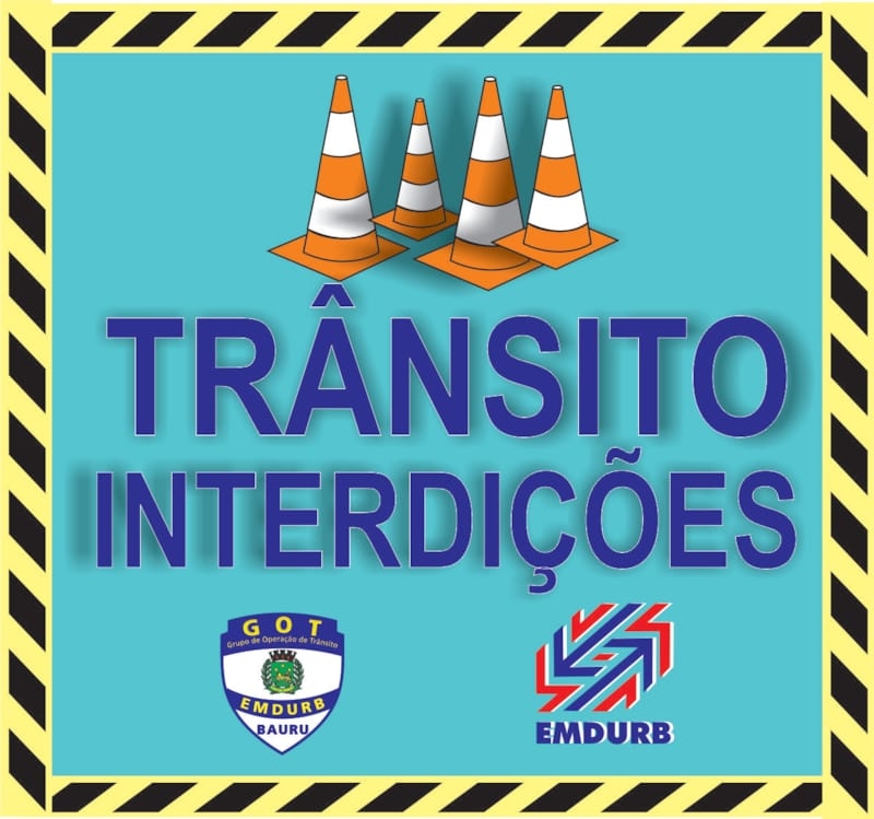 A Diretoria de Sistema Viário e Transportes da EMDURB, por meio do GOT, informa as seguintes interdições:-Interdição no quarteirão 15 da rua Fuas de Matos Sabino, a partir das 07h30, para obras do DAE;-Interdição no cruzamento das ruas Paulino Rafael com as ruas Barra Bonita, rua Aviador Edu Chaves e rua Calil Rahal, a partir das 7h30, para pintura de faixa de pedestre;-Interdição no cruzamento da avenida Nossa Senhora de Fátima com a rua Gustavo Maciel, a partir 07h30, para pintura de faixa de pedestre;-Interdição do quarteirão 03 ao 09 da rua Bras Fernandes, a partir das 13h30,para pintura de legenda Pare e faixa amarela nos cruzamentos;-Interdição no cruzamento da Benedito Pereira Pinto com a rua Abrahão Rahal, a partir das 13h30, para pintura de faixa de pedestre;-Interdição no cruzamento da avenida das Bandeiras com a rua Wadih Habib Cury, a partir das 13h30, para pintura de faixa de pedestre.Os locais estarão sinalizados pelo GOT – Grupo de Operações de Trânsito. A EMDURB pede atenção aos motoristas.
