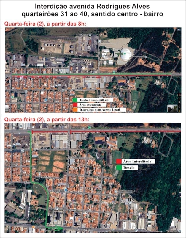 A interdição será do quarteirão 31 ao 40Período da manhã, a partir das 8h: A EMDURB informa que nesta quarta-feira (02), o trecho compreendido entre os quarteirões 31 ao 40 da avenida Rodrigues Alves, no sentido centro - bairro, estarão interditados para obras de recape. A pista do sentido bairro – centro terá compartilhamento de fluxo de veículos, desta forma, poderá haver lentidão no trânsito.Período da tarde, a partir das 13h: A partir das 13h, o trecho compreendido entre os quarteirões 34 ao 40 da avenida Rodrigues Alves, no sentido centro - bairro, continuará interditado. Porém, NÃO haverá compartilhamento de fluxo de veículos na pista contrária.O desvio será pela rua Francisco de Souza Barbosa, rua Espírito Santo, rua Antônio Cintra Júnior, avenida Cruzeiro do Sul, seguindo sentido bairro. Para o desvio, a rua Francisco de Souza Barbosa terá o sentido de circulação invertido, sendo da avenida Rodrigues Alves para a rua Espírito Santo. Os locais estarão sinalizados pelo GOT – Grupo de Operações de Trânsito. A EMDURB pede atenção aos motoristas.Comunicação – EMDURB