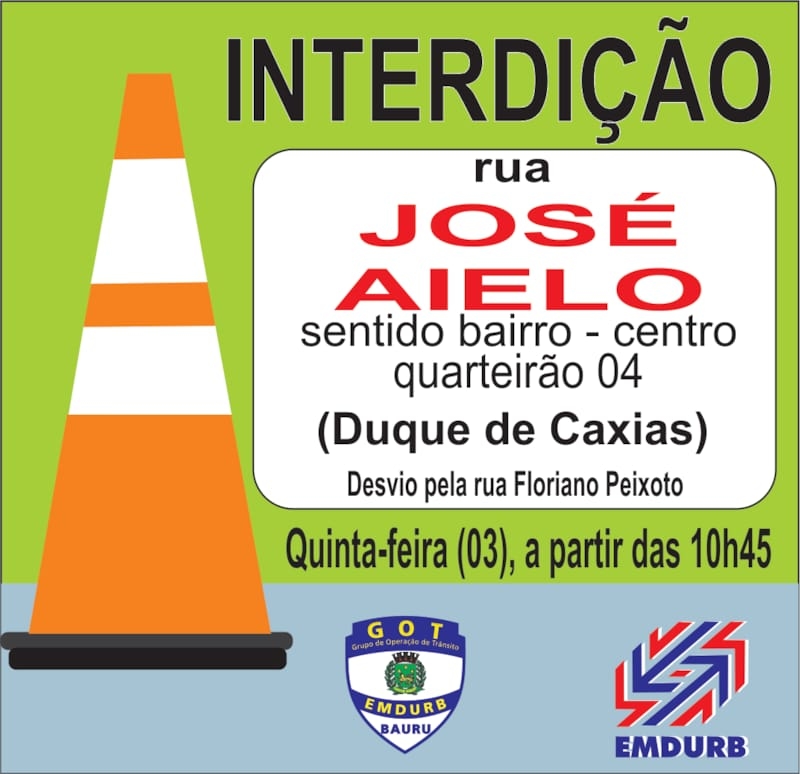 A Diretoria de Sistema Viário e Transportes da EMDURB, por meio do GOT, informa que o quarteirão 04 da rua José Aielo, sentido bairro – centro, entre as ruas Floriano Peixoto e Quintino Bocaiúva, será interditado às 10h45 para obras emergencial do DAE. Para tanto, será fechado o cruzamento da rua Floriano Peixoto. O desvio será pela rua Floriano Peixoto, rua Domingos Plete, rua Quintino Bocaiúva, voltando para a rua José Aielo, seguindo sentido centro. Para veículos grandes (caminhões), a recomendação é a rua Capitão Gomes Duarte ao invés da Domingos Plete, uma vez que a capacidade de fluxo da Capitão Gomes Duarte é maior.