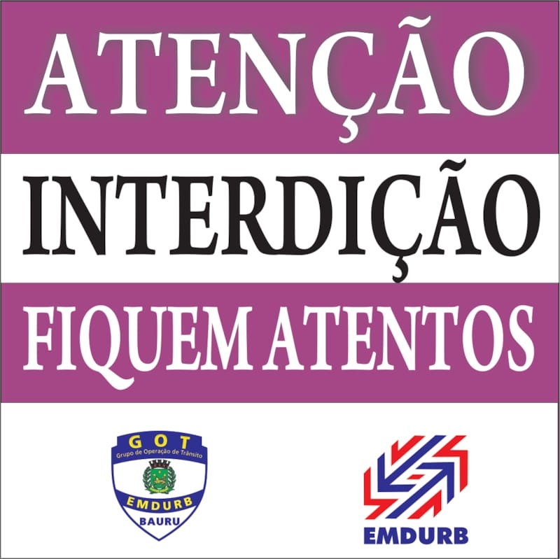 A Diretoria de Sistema Viário e Transportes da EMDURB, por meio do GOT, informa as seguintes interdições:-Interdição no cruzamento das ruas Alfredo Rodrigues de Souza com Roque Urias Batista, a partir das 7h30, para pintura de faixa de pedestre;-Interdição no cruzamento das ruas Arlindo Pinto Ferreira com Alberto Badine e João Criado Álvares, a partir das 7h30, para pintura de faixa de pedestre;-Interdição no cruzamento das ruas Afonso Pena com Rua Olavo Bilac, a partir das 7h30, para pintura de faixa de pedestre;-Interdição no quarteirão 05, da rua Presidente kennedy, a partir das 7h30, para obras do DAE;-Interdição no quarteirão 05, da avenida Maria Ranieri, a partir das 13h30, para pintura de faixa de pedestre e legenda DEVAGAR ESCOLA;-Interdição no cruzamento das ruas Argentina com Equador, a partir das 13h30, para pintura de faixa de pedestre;-Interdição no quarteirão 09 da rua Antônio Pereira, a partir das 13h30, para pintura de legenda Pare e faixa amarela dupla.Os locais estarão sinalizados pelo GOT – Grupo de Operações de Trânsito. A EMDURB pede atenção aos motoristas.Comunicação – EMDURB
