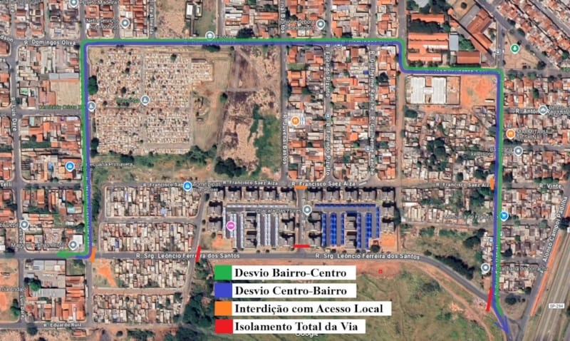 No sentido Centro – Bairro, o desvio será: rua Sargento Leôncio Ferreira dos Santos, rua Nelson Tozoni Decarllis, rua Domingos Oliva, rua Luiz Carlos Machado Ballaminut, rua João Prudente Sobrinho, rua Benedito Daniel, retornando para rua Sargento Leôncio Ferreira dos Santos.