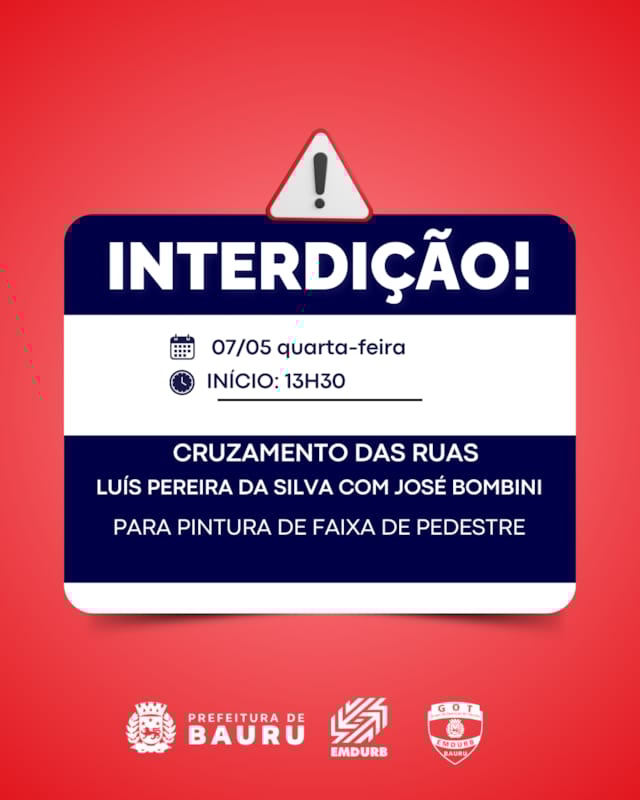 -Interdição no cruzamento das Luís Pereira da Silva com José Bombini, a partir das 13h30, para pintura de faixa de pedestre;