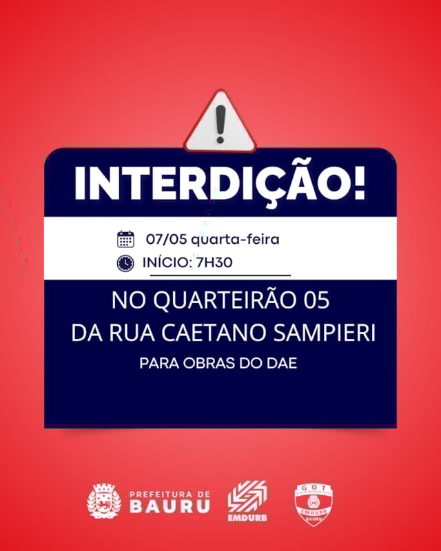 -Interdição no quarteirão 05 da rua Caetano Sampieri, a partir das 07h30, para obras do DAE;