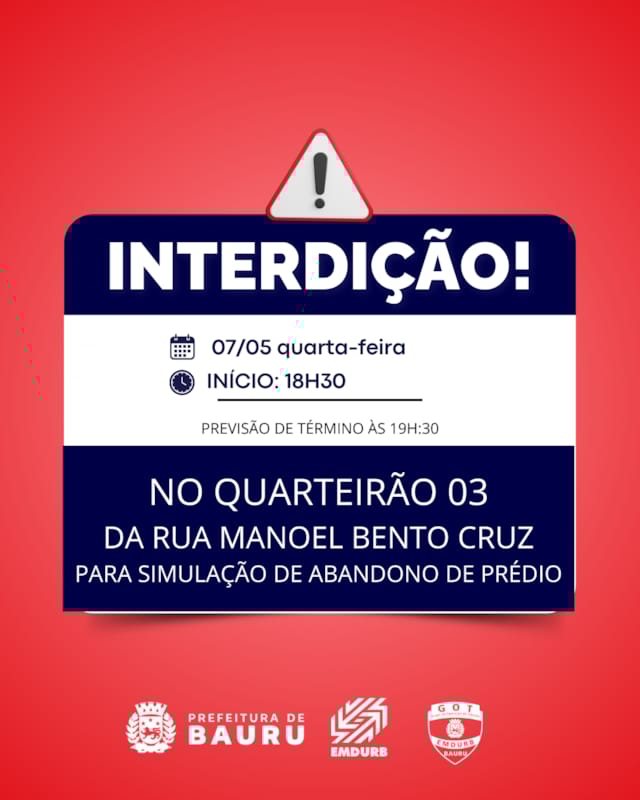 -Interdição no quarteirão 03 da rua Manoel Bento Cruz, nos seguintes horários: das 9h às 10h, das 15h às 16h e das 18h30 às 19h30, para simulação de abandono de prédio.