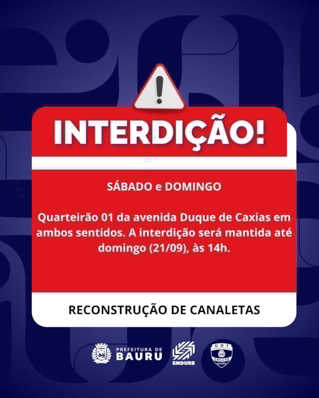 -Continuação da interdição do quarteirão 01 da avenida Duque de Caxias, em ambos sentidos, para serviço de reconstrução e nivelamento de canaletas de drenagem. A interdição será mantida até as 14h de domingo (21).