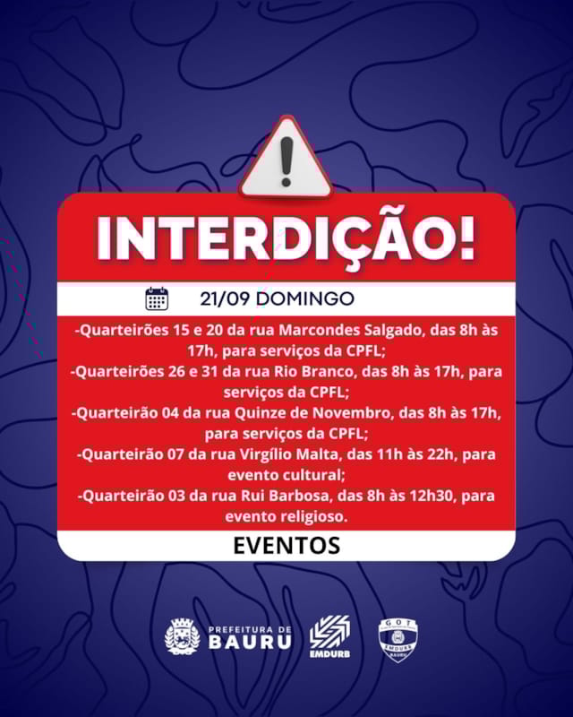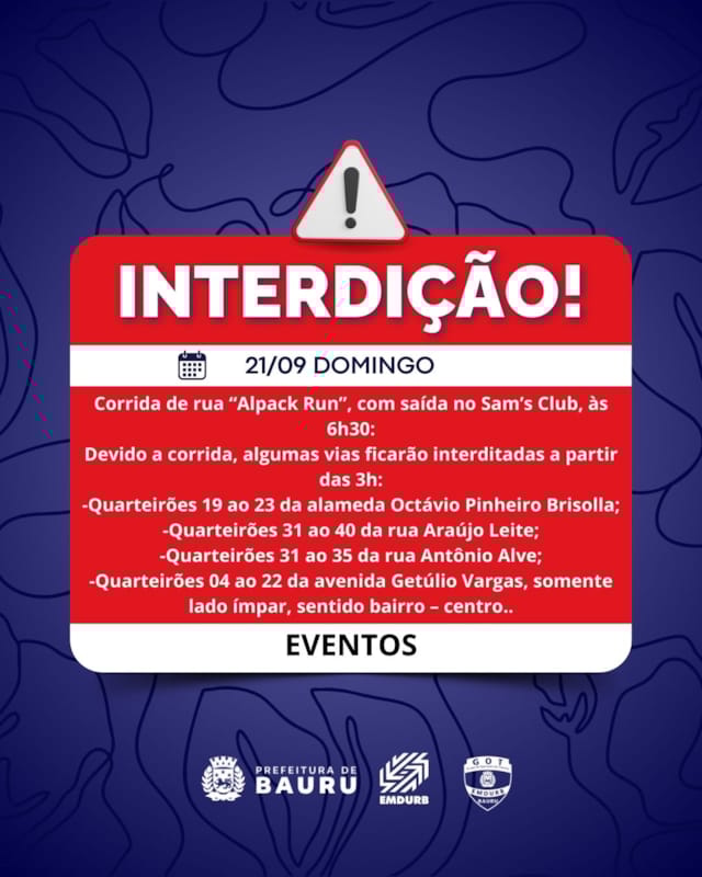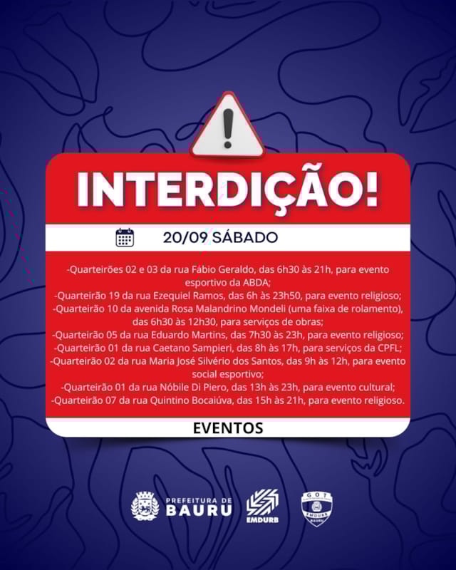 A Diretoria de Sistema Viário e Transportes da EMDURB, por meio do GOT, informa as seguintes interdições:SÁBADO (20):-Quarteirões 02 e 03 da rua Fábio Geraldo, das 6h30 às 21h, para evento esportivo da ABDA;-Quarteirão 19 da rua Ezequiel Ramos, das 6h às 23h50, para evento religioso;-Quarteirão 10 da avenida Rosa Malandrino Mondeli (uma faixa de rolamento), das 6h30 às 12h30, para serviços de obras;-Quarteirão 05 da rua Eduardo Martins, das 7h30 às 23h, para evento religioso;-Quarteirão 01 da rua Caetano Sampieri, das 8h às 17h, para serviços da CPFL;-Quarteirão 02 da rua Maria José Silvério dos Santos, das 9h às 12h, para evento social esportivo;-Quarteirão 01 da rua Nóbile Di Piero, das 13h às 23h, para evento cultural;-Quarteirão 07 da rua Quintino Bocaiúva, das 15h às 21h, para evento religioso;-Continuação da interdição do quarteirão 01 da avenida Duque de Caxias, em ambos sentidos, para serviço de reconstrução e nivelamento de canaletas de drenagem. A interdição será mantida até as 14h de domingo (21).DOMINGO (21):-Quarteirões 15 e 20 da rua Marcondes Salgado, das 8h às 17h, para serviços da CPFL;-Quarteirões 26 e 31 da rua Rio Branco, das 8h às 17h, para serviços da CPFL;-Quarteirão 04 da rua Quinze de Novembro, das 8h às 17h, para serviços da CPFL;-Quarteirão 07 da rua Virgílio Malta, das 11h às 22h, para evento cultural;-Quarteirão 03 da rua Rui Barbosa, das 8h às 12h30, para evento religioso;-Continuação da interdição do quarteirão 01 da avenida Duque de Caxias, em ambos sentidos, para serviço de reconstrução e nivelamento de canaletas de drenagem. A interdição será mantida até as 14h de domingo (21).Corrida de rua “Alpack Run”, com saída no Sam’s Club, às 6h30:Devido a corrida, algumas vias ficarão interditadas a partir das 3h:-Quarteirões 19 ao 23 da alameda Octávio Pinheiro Brisolla, em ambos os sentidos (entre a rua Cláudio Zwicker até a rotatória com a rua Chaim Mauad);-Quarteirões 31 ao 40 da rua Araújo Leite (entre a rua João Abo Arrage até a rua Cláudio Zwicker);-Quarteirões 31 ao 35 da rua Antônio Alves (entre a rua João Abo Arrage até a rua Alexandre Ignácio Nasralla);-Quarteirões 04 ao 22 da avenida Getúlio Vargas, somente lado ímpar, sentido bairro – centro (entre a rua João Abo Arrage até a rotatória do cruzamento da Getúlio Vargas com a Nossa Senhora de Fátima).SEGUNDA-FEIRA (22):-Interdição parcial no cruzamento da avenida Getúlio Vargas com rua Clóvis Barreto Melchert, a partir das 7h30, para pintura de faixas de pedestres;-Interdição parcial no cruzamento da avenida Nossa Senhora de Fátima com Rua Clovis Barreto Melchert, a partir das 7h30, para pintura de faixas de pedestres;-Interdição parcial na rotatória avenida Getúlio Vargas com avenida Odilon Braga, a partir das 13h30, para pintura de faixas de pedestres.Os locais estarão sinalizados pelo GOT – Grupo de Operações de Trânsito. A EMDURB pede atenção aos motoristas.Acesse o link e participe da comunidade GOT e receba nossas interdições.https://chat.whatsapp.com/H9DZAyZCfXf3ata4FZ2gyqComunicação – EMDURB