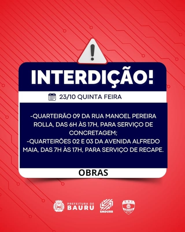 A Diretoria de Sistema Viário e Transportes da EMDURB, por meio do GOT, informa as seguintes interdições:-Quarteirão 09 da rua Manoel Pereira Rolla, das 6h às 17h, para serviço de concretagem;-Quarteirões 02 e 03 da avenida Alfredo Maia, das 7h às 17h, para serviço de recape;-Cruzamento da rua Engenheiro Xerxes Ribeiro dos Santos com Adante Gigo, a partir das 7h30, para pintura de faixas de pedestres;-Cruzamento da rua Engenheiro Xerxes Ribeiro dos Santos com Alziro Zarur, a partir das 13h30, para pintura de faixas de pedestres. Os locais estarão sinalizados pelo GOT – Grupo de Operações de Trânsito. A EMDURB pede atenção aos motoristas.Acesse o link e participe da comunidade GOT e receba as interdições.https://chat.whatsapp.com/H9DZAyZCfXf3ata4FZ2gyqComunicação – EMDURB