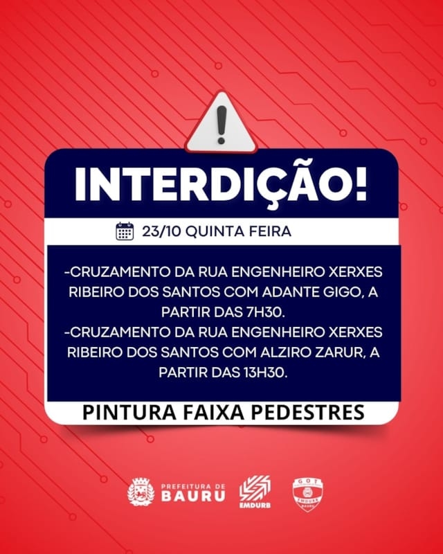 -Cruzamento da rua Engenheiro Xerxes Ribeiro dos Santos com Alziro Zarur, a partir das 13h30, para pintura de faixas de pedestres.
