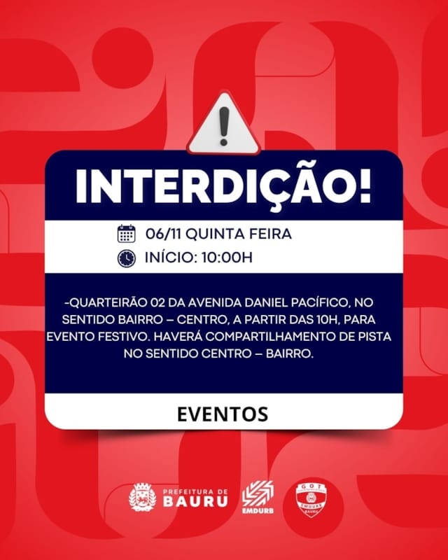 A Diretoria de Sistema Viário e Transportes da EMDURB, por meio do GOT, informa a seguinte interdição:-Quarteirão 02 da avenida Daniel Pacífico, no sentido bairro – centro, a partir das 10h, para evento festivo. Haverá compartilhamento de pista no sentido centro – bairro. Os locais estarão sinalizados pelo GOT – Grupo de Operações de Trânsito. A EMDURB pede atenção aos motoristas.Acesse o link e participe da comunidade GOT e receba as interdições.https://chat.whatsapp.com/H9DZAyZCfXf3ata4FZ2gyqComunicação – EMDURB