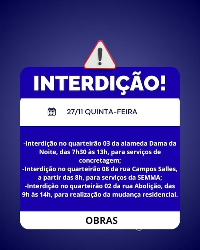 -Interdição no quarteirão 08 da rua Campos Salles, a partir das 8h, para serviços da SEMMA;