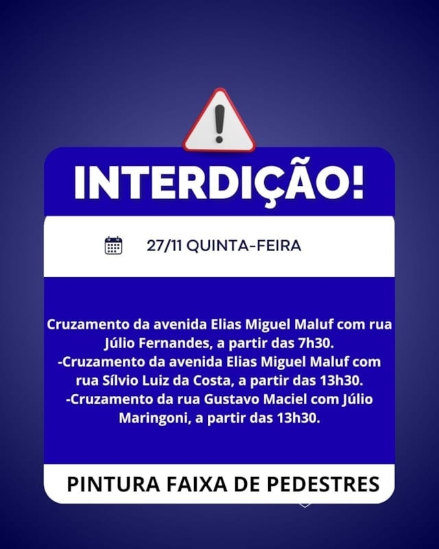 -Cruzamento da avenida Elias Miguel Maluf com rua Júlio Fernandes, a partir das 7h30, para pintura de faixas de pedestres;